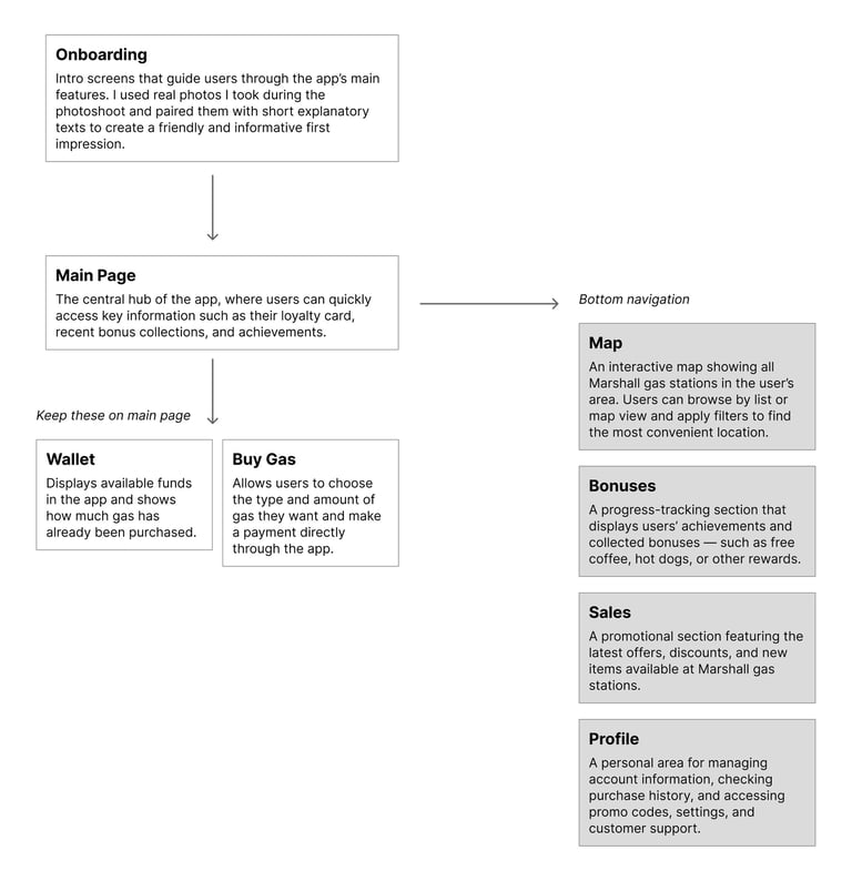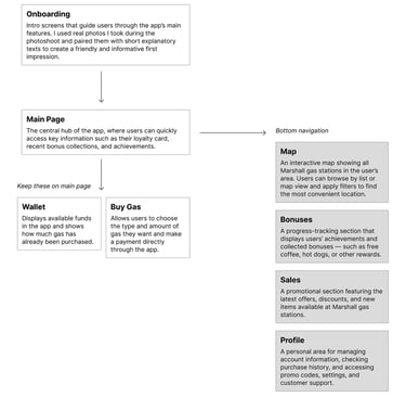 I conducted on-site photoshoots at Marshall gas stations, capturing both real locations and people to reflect the brand’s authentic, friendly atmosphere. These visuals were later used in the app onboarding screens to create an engaging and trustworthy first impression.