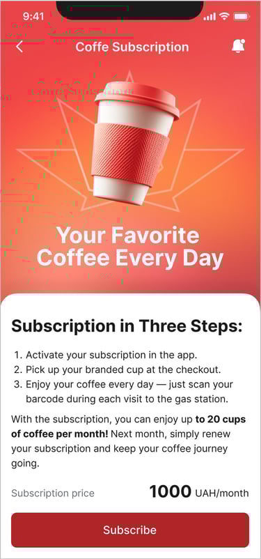 I designed the full user experience — from wireframes and interactive prototypes to the final UI. The app allows users to purchase fuel, collect and redeem bonuses, and access rewards like free coffee or snacks, making everyday refueling more enjoyable and rewarding.