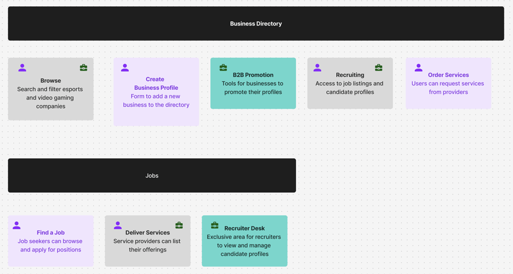 Using a color-coded legend and intuitive icons, I mapped out the platform’s navigation, resulting in two main service branches that clearly organize the user journey. The branches are illustrated below to show how functionality are structured across the platform.