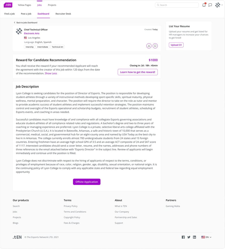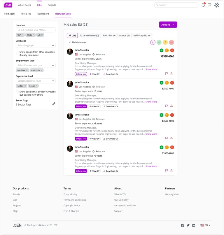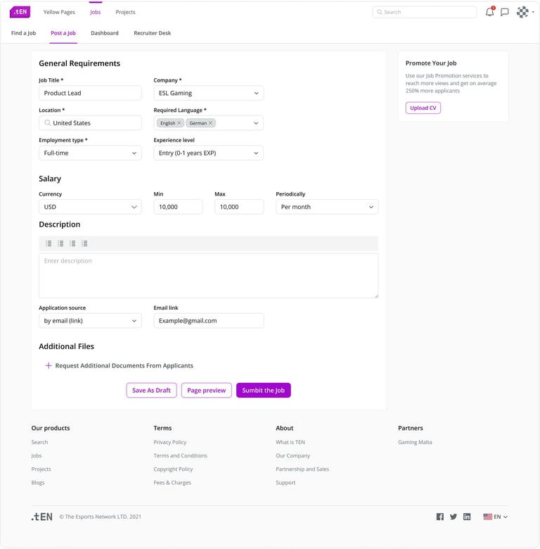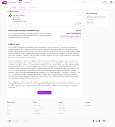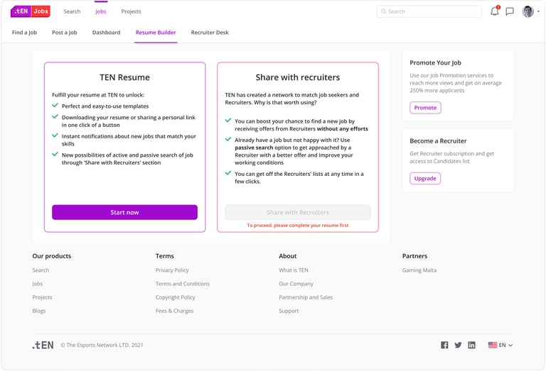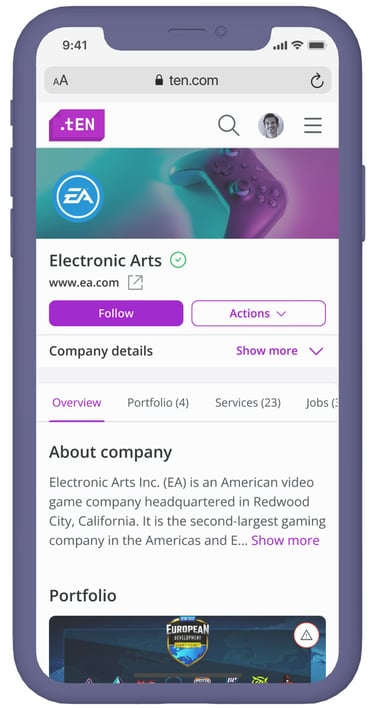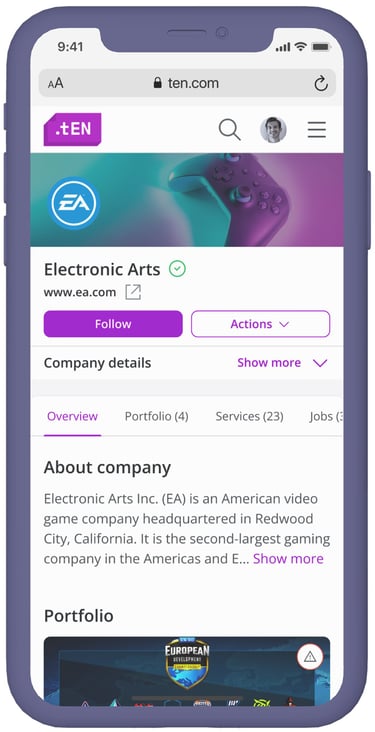 TEN is a business-platform for the esports and video gaming industry, built to connect companies, professionals, and service providers in a B2B ecosystem. It provides a directory of esports and gaming businesses, a marketplace to provide or order services, job listings, candidate profiles, and tools for promotion and communication.